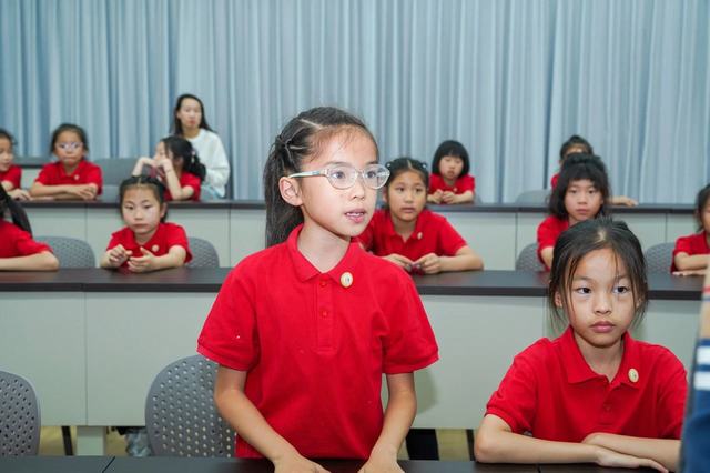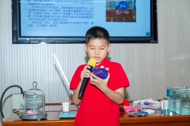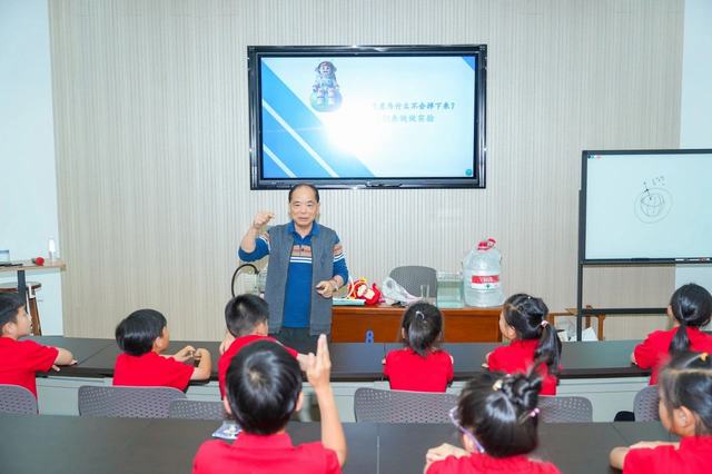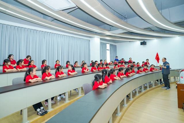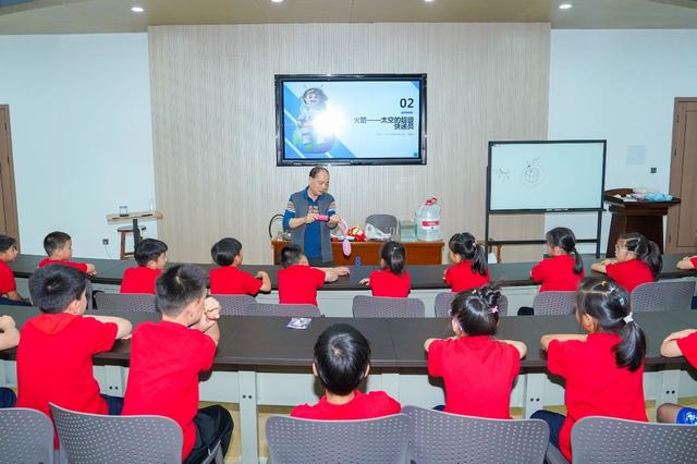 現(xiàn)場(chǎng)參觀結(jié)束后,孩子們們來到企業(yè)文化中心階梯教室參加名師講課。此次活動(dòng)集團(tuán)特別邀請(qǐng)金華一中退休教師陳保平老師開展“飛向太空奇妙之旅”主題講座。陳老師深耕物理教學(xué)四十余年,曾任金華一中物理教研組長(zhǎng),培養(yǎng)出上百位博士/博士后人才,執(zhí)掌金外三屆創(chuàng)新班教學(xué),系學(xué)科帶頭人?,F(xiàn)受聘火箭軍授課,助力士官考取解放軍火箭工程大學(xué)。講座開始前,先由金華師范附屬小學(xué)杜葛瑾同學(xué)分享了今年四月同爸爸媽媽一起受邀請(qǐng)去酒泉東風(fēng)航天城,觀看神舟二十號(hào)載人火箭發(fā)射的精彩故事。杜同學(xué)描述生動(dòng)并且用一張張照片向同學(xué)們耐心講解這次難忘的旅行,其中最為激動(dòng)的是親眼看見火箭升天的壯觀景象?;鸺睕_云霄,作為新一代的少年,內(nèi)心沸騰,久久不能平靜,自豪感油然而生,心中滿是對(duì)航天員的崇敬與祝福。