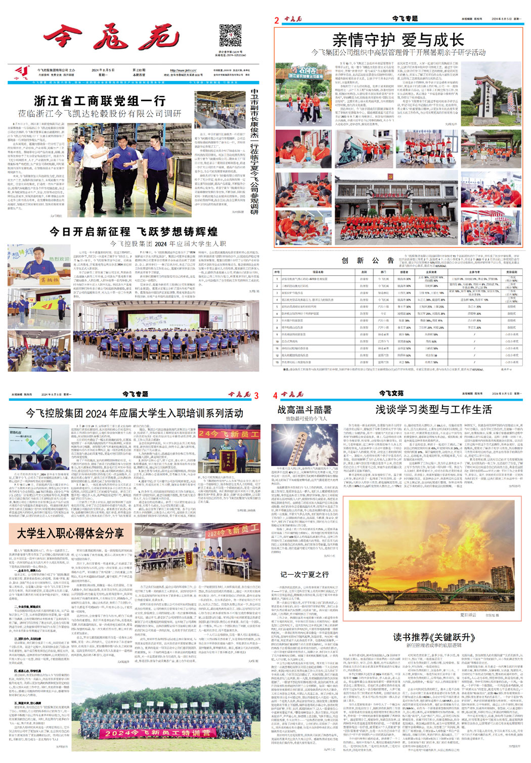 浙江省工商聯(lián)黨組一行蒞臨浙江今飛凱達輪轂股份有限公司調研今日開啟新征程,飛躍夢想鑄輝煌——今飛控股集團2024年應屆大學生入職中衛(wèi)市副市長康俊杰一行蒞臨寧夏今飛參觀調研親情守護 愛與成長丨今飛集團公司組織中高層管理骨干開展暑期親子研學活動創(chuàng) 新 公 告今日開啟新征程,飛躍夢想鑄輝煌——今飛控股集團2024年應屆大學生入職培訓系列活動入職培訓拓展心得心得體會讀書推薦《關鍵躍升》新任管理者成事的底層邏輯戰(zhàn)高溫,斗酷暑——致敬最可愛的今飛人記一次寧夏之行淺談學習類型與工作生活今飛控股集團新人培訓心得體會
