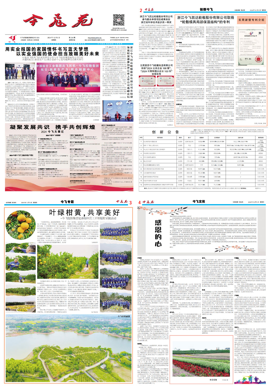 用實(shí)業(yè)報(bào)國(guó)的家國(guó)情懷書寫藍(lán)天夢(mèng)想 以實(shí)業(yè)強(qiáng)國(guó)的使命擔(dān)當(dāng)放眼美好未來(lái)——中航沈飛民用飛機(jī)有限責(zé)任公司與今飛控股集團(tuán)有限公司合作共建的航空(新質(zhì)生產(chǎn)力)聯(lián)合創(chuàng)新中心簽約揭牌儀式順利舉行凝聚發(fā)展共識(shí) 攜手共創(chuàng)輝煌——2024今飛大事記浙江今飛凱達(dá)輪轂股份有限公司總經(jīng)理張建權(quán)受邀參加2024浙江省上市公司高峰論壇喜報(bào)丨浙江今飛凱達(dá)輪轂股份有限公司參與聯(lián)合申報(bào)項(xiàng)目成果榮獲浙江省科學(xué)技術(shù)進(jìn)步獎(jiǎng)一等獎(jiǎng)云南富源今飛輪轂制造有限公司榮獲“2024云南企業(yè)100強(qiáng)”、“2024云南制造業(yè)企業(yè)100強(qiáng)”榮譽(yù)稱號(hào)浙江今飛凱達(dá)輪轂股份有限公司取得“輪轂?zāi)>呔植勘亟Y(jié)構(gòu)”的專利創(chuàng) 新 公 告葉綠柑黃,共享美好——今飛控股集團(tuán)黨委組織員工開(kāi)展椪柑采摘活動(dòng)橙黃橘紅感恩的心